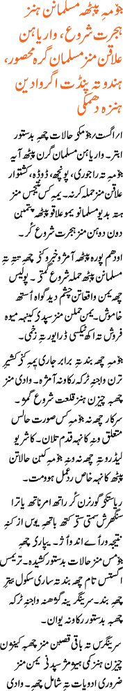 Disclaimer: The opinions expressed in the news and the articles published on this site are authors' and do not respresent those of the owner or the editors of this site. Koshur Akhbar is not a political, religious or commercial venture. It's mainly published to help promote and increase mother tongue literacy among the speakers of the Kashmiri language worldwide. Acknowledgements: We are thankful to all the authors for their support and also to the readers who have shown great appreciation for our efforts. Contact Editor at editor@neabinternational.org |