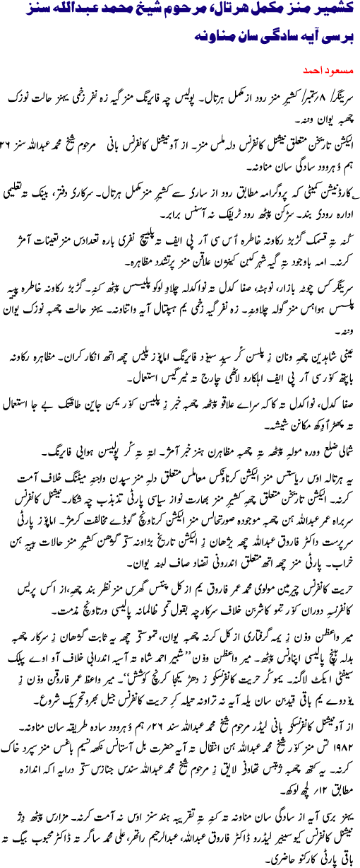 Disclaimer: The opinions expressed in the news and the articles published on this site are authors' and do not respresent those of the owner or the editors of this site. Koshur Akhbar is not a political, religious or commercial venture. It's mainly published to help promote and increase mother tongue literacy among the speakers of the Kashmiri language worldwide. Acknowledgements: We are thankful to all the authors for their support and also to the readers who have shown great appreciation for our efforts. Contact Editor at editor@neabinternational.org Copyright: © All rights including translation into other languages, reproduction in part or full, use to an end, are reserved and protected in all countries by the International Copyright Convention and Universal Copyright Conventions.Nothing that appears in this website may be reproduced without a written, prior permission of the publisher.