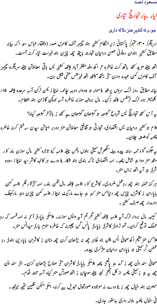 Disclaimer: The opinions expressed in the news and the articles published on this site are authors' and do not respresent those of the owner or the editors of this site. Koshur Akhbar is not a political, religious or commercial venture. It's mainly published to help promote and increase mother tongue literacy among the speakers of the Kashmiri language worldwide. Acknowledgements: We are thankful to all the authors for their support and also to the readers who have shown great appreciation for our efforts. Contact Editor at editor@neabinternational.org Copyright: © All rights including translation into other languages, reproduction in part or full, use to an end, are reserved and protected in all countries by the International Copyright Convention and Universal Copyright Conventions.Nothing that appears in this website may be reproduced without a written, prior permission of the publisher.